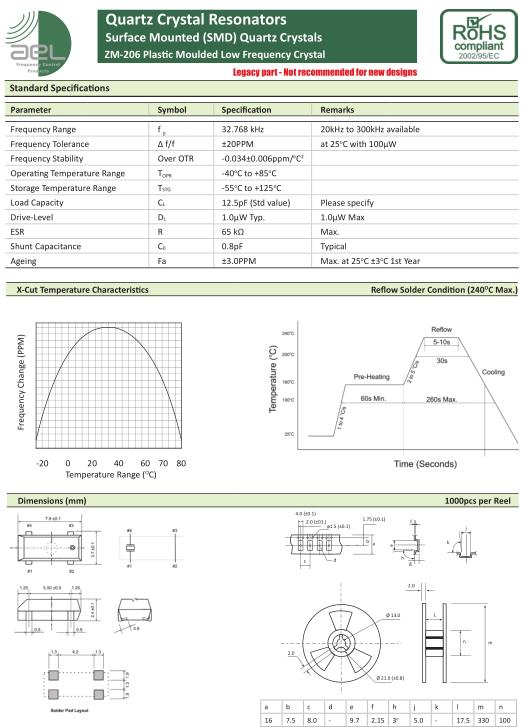 AEL晶振,ZM-206晶振,SMD晶振,32.768K時鐘晶體具有小型,薄型,輕型的貼片晶振表面音叉型晶體振蕩器,產品具有優良的耐熱性,耐環境特性,可發揮晶振優良的電氣特性,符合RoHS規定,滿足無鉛焊接的高溫回流溫度曲線要求,金屬外殼的封裝使得產品在封裝時能發揮比陶瓷振蕩器外殼更好的耐沖擊性.