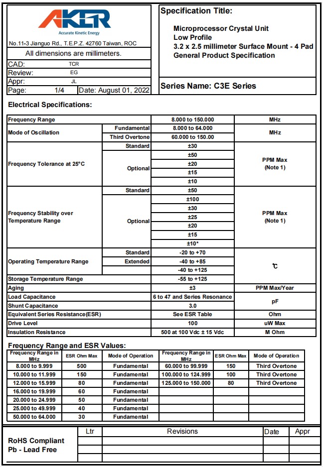 | C3E-25.000-8-50100-X1-R | Aker晶振 | Crystal 25MHz ±50ppm (Tol) ±100ppm (Stability) 8pF FUND 100Ohm Automotive 4-Pin SMD T/R |