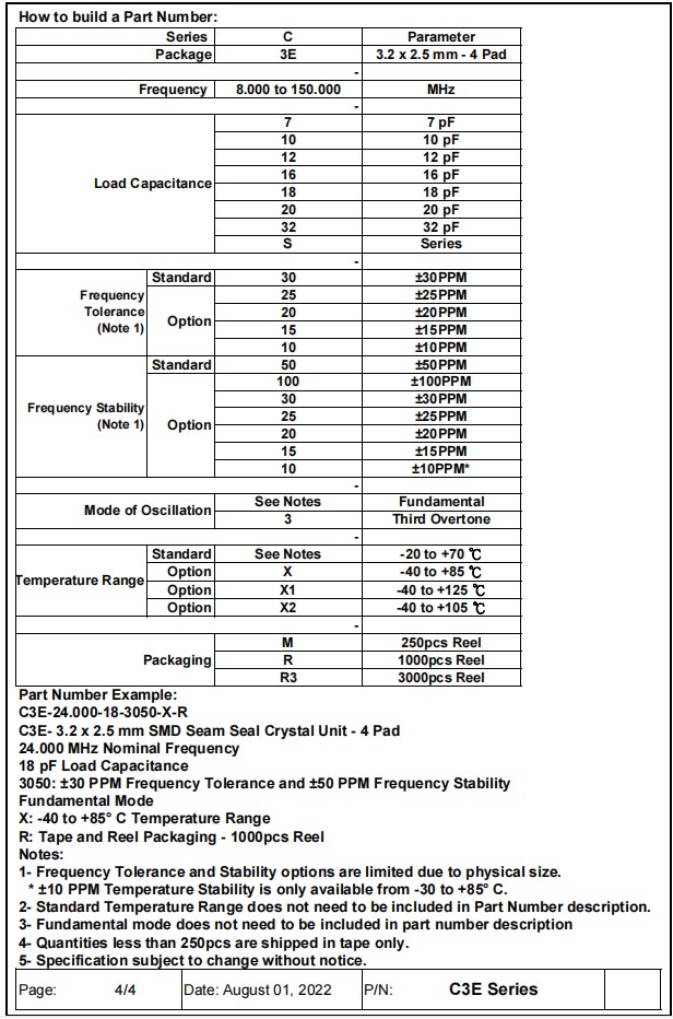 | C3E-25.000-10-1530-X-R | Aker晶振 | Crystal 25MHz ±15ppm (Tol) ±30ppm (Stability) 10pF FUND 100Ohm 4-Pin SMD T/R |