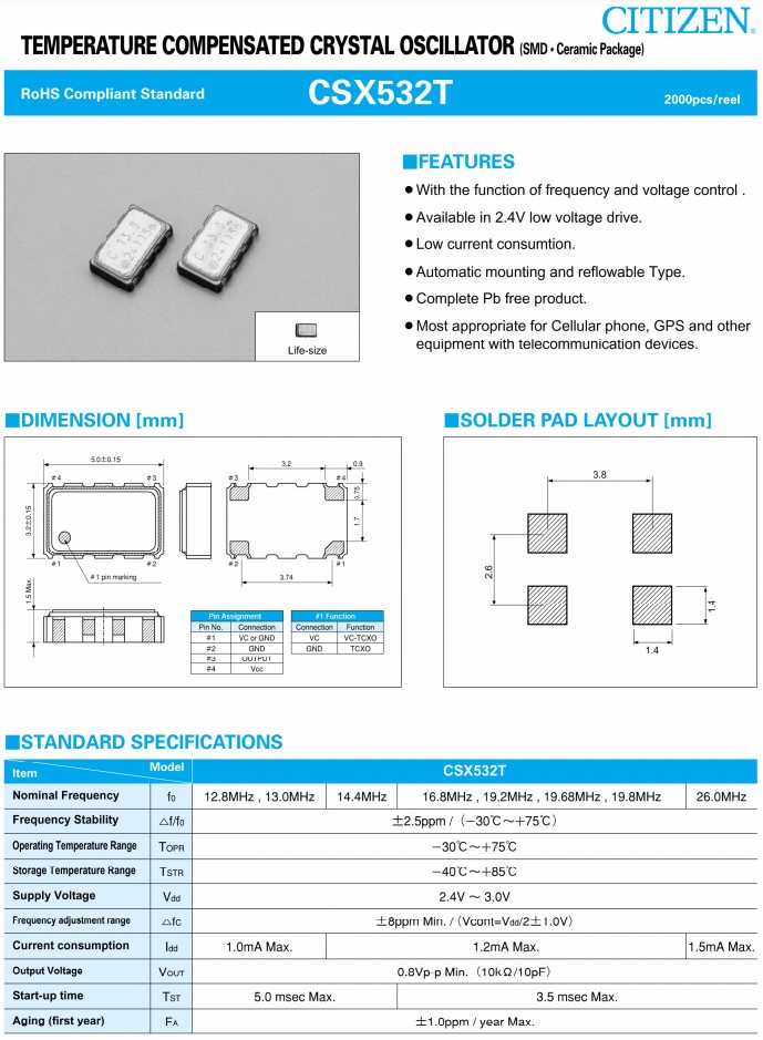 | Citizen晶振 | CSX532T26.000M1-UT10 | CSX532T | 26MHz | TCXO | 2.4 V ~ 3 V |