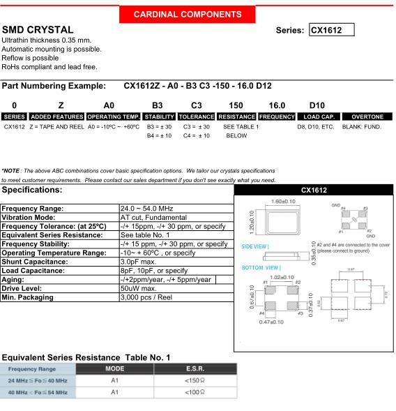 Cardinal晶振,CX1612晶振,CX1612Z-A0B3C3-150-16.0D12晶振,貼片晶振本身體積小,超薄型石英晶體振蕩器,特別適用于有目前高速發(fā)展的高端電子數(shù)碼產(chǎn)品,因為晶振本身小型化需求的市場領(lǐng)域,小型,薄型是對應(yīng)陶瓷振蕩器(偏差大)和普通的石英晶體振蕩器(偏差小)的中間領(lǐng)域的一種性價比較出色的產(chǎn)品.產(chǎn)品廣泛用于筆記本電腦,無線電話,衛(wèi)星導(dǎo)航SSD,USB,Blu-ray等用途,符合無鉛焊接的高溫回流焊曲線特性.