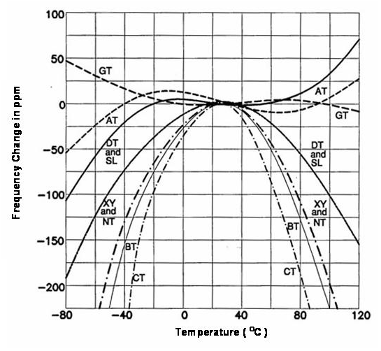 大部份的石英晶體產(chǎn)品是用于電子線路上的參考頻率基準(zhǔn)或頻率控制組件, 所以, 頻率與工作環(huán)境溫度的特性是一個(gè)很重要的參數(shù). 事實(shí)上, 良好的頻率與溫度(frequeny versus temperature)特性也是選用石英做為頻率組件的主要因素之一. 經(jīng)由適當(dāng)?shù)亩x及設(shè)計(jì), 石英晶體組件可以很容易的就滿足到以百萬(wàn)分之一 (parts per million, ppm) 單位等級(jí)的頻率誤差范圍. 若以離散電路方式將LCR零件組成高頻振蕩線路, 雖然也可以在小量"7XZ-32.768KDA-T"生產(chǎn)規(guī)模達(dá)到所需要的參考頻率信號(hào)誤差在ppm或sub-ppm等級(jí)要求, 可是這種方式無(wú)法滿足產(chǎn)業(yè)要達(dá)到的量產(chǎn)規(guī)模. 石英組件的頻率對(duì)溫度特性更是離散振蕩線路無(wú)法簡(jiǎn)易達(dá)成的. 在(如圖) 中提供了數(shù)種不同的石英晶體切割角度的頻率對(duì)溫度特性曲線.