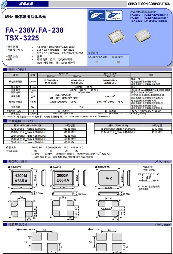MPU時鐘專用晶振FA-238,Q22FA23800001,3225mm,12pF,20MHz,±50ppm,參數圖