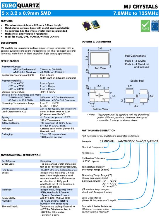 Euroquartz晶振,MJ晶振,12.000MHz-MJ/20/30/-10+60/18pF/60R晶振 ,小型表面貼片晶振型,是標準的石英晶體振蕩器,適用于寬溫范圍的電子數碼產品,家電電器及MP3,MP4,播放器,單片機等領域.可對應8.000MHz以上的頻率,在電子數碼產品,以及家電相關電器領域里面發揮優良的電氣特性,滿足無鉛焊接的回流溫度曲線要求.