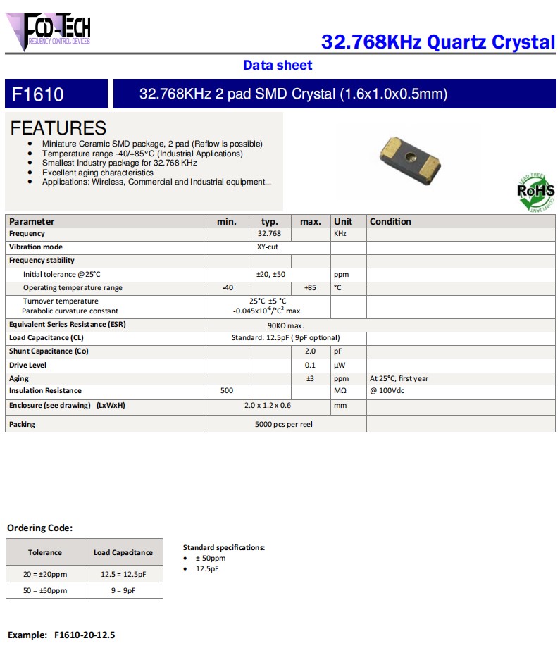 F1610‐20‐12.5,32.768KHz,1610mm,FCD-Tech時(shí)鐘晶振,F1610,超小型晶振,參數(shù)表