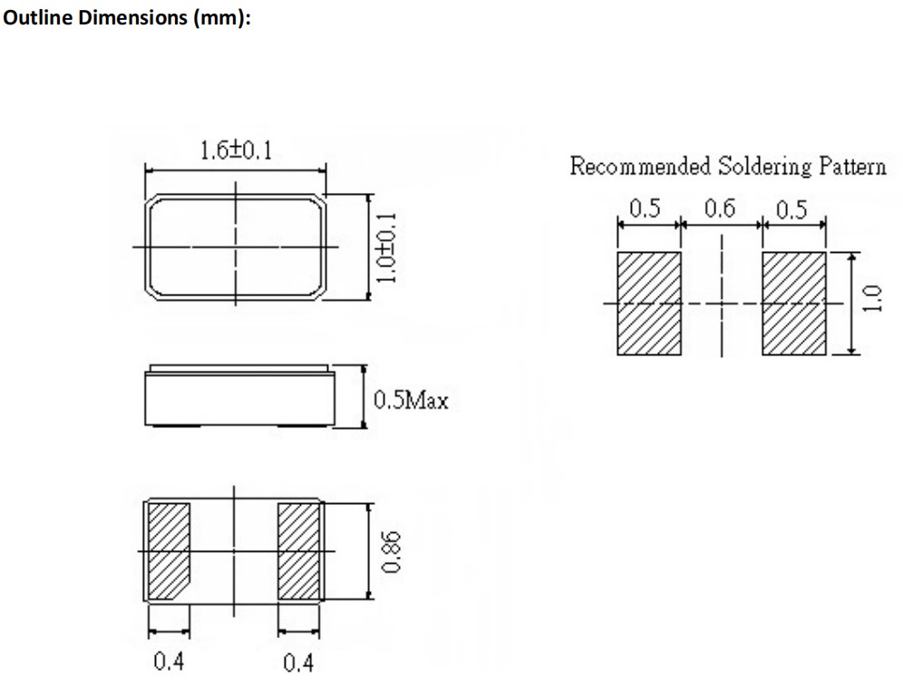小體積晶振尺寸:1.6x1.0x0.5mm