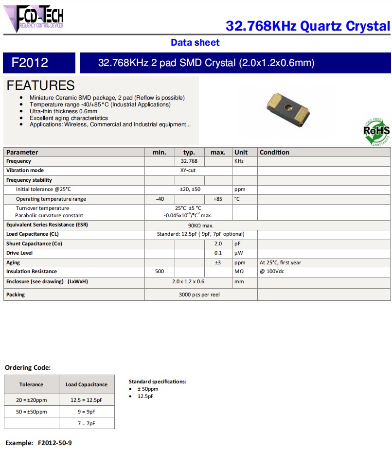 F2012‐50‐7,32.768KHz,2012mm,FCD-Tech無源晶振,F2012,計時器應(yīng)用晶振,參數(shù)表