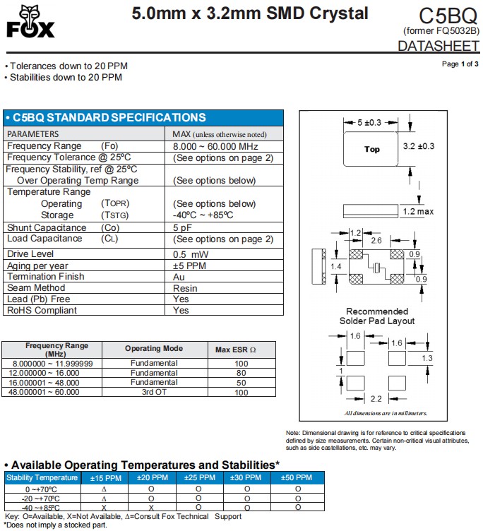 | FQ5032BR-16.000 | Fox晶振 | C5BQ | 16MHz | ±50ppm |