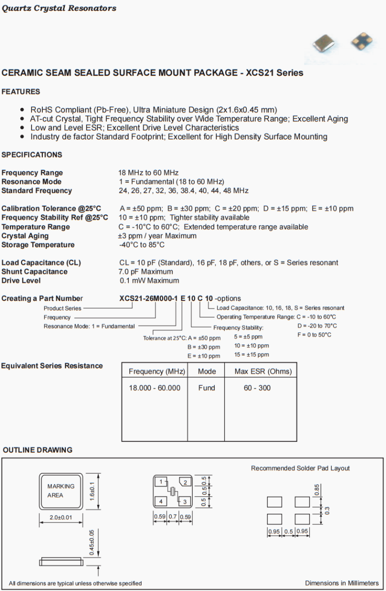 富通美國晶振,XCS21-20M000-1E10D16醫(yī)療設(shè)備晶振,XCS21超小型晶振,美國Fortiming晶振公司,富通晶振,超小型晶振,XCS21晶振,XCS21-20M000-1E10D16晶振,2016晶振,陶瓷SEAM密封表面貼裝封裝- XCS21系列,特點,超小型設(shè)計(2x1.6x0.45 mm), at切割晶體,寬溫度范圍內(nèi)緊密的頻率穩(wěn)定性;優(yōu)異的老化性能,低水平的ESR;卓越的驅(qū)動級特性,符合RoHS標準(無鉛),行業(yè)標準的足跡;非常適合高密度表面安裝,醫(yī)療設(shè)備晶振,低損耗晶振,SMD晶振,四腳晶振,低成本晶振,環(huán)保無鉛晶振,高穩(wěn)定性晶振,石英晶振,貼片晶振,網(wǎng)絡(luò)終端晶振,無源晶振。