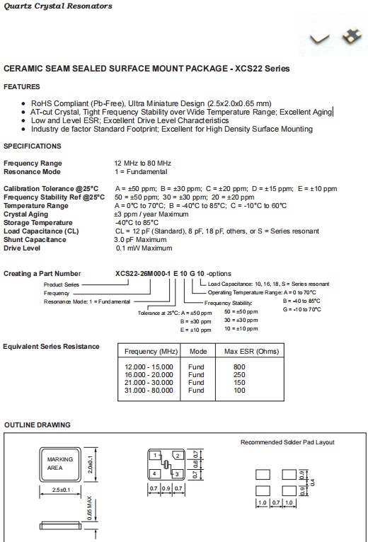XCS22歐美晶振,Fortiming無人機晶振,XCS22-11M0592-1E20B18耐沖擊晶振,美國Fortiming晶振公司,富通晶振,XCS22晶振,2520晶振,XCS22-11M0592-1E20B18晶振,無源晶振陶瓷SEAM密封表面安裝包- XCS22系列具有RoHS兼容(無鉛),超微型設計(2.5x2.0x0.65 mm)切割晶體,在寬溫度范圍內的頻率穩定性;優良的低老化水平和水平ESR;優秀的驅動水平特性行業因素標準足跡;適用于高密度表面安裝.石英晶振,貼片晶振,超小型晶振,網絡終端晶振,醫療設備晶振,低損耗晶振,SMD晶振,四腳晶振,低成本晶振,環保無鉛晶振,高穩定性晶振,