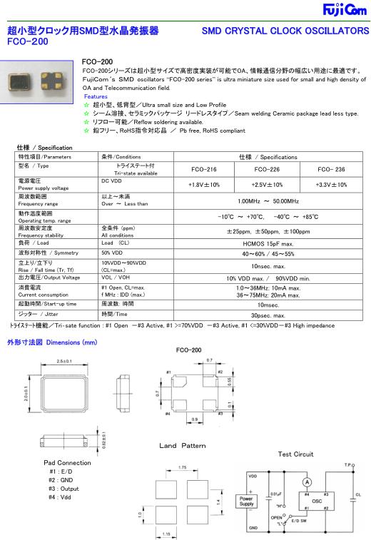 Fujicom晶振,FCO-216晶振,時鐘振蕩器,有源晶振,是指晶體本身起振需要外部電壓供應,起振后可直接驅(qū)動CMOS集成電路,產(chǎn)品本身已實現(xiàn)與薄型IC(TSSOP封裝,TVSOP封裝)同樣的1mm厚度,斷開時的消費電流是15µA以下,編帶包裝方式可對應自動搭載及IR回流焊接(無鉛對應)產(chǎn)品有幾種電壓供選1.8V,2.5V,3V3.3V,5V,以應對不同IC產(chǎn)品需要.