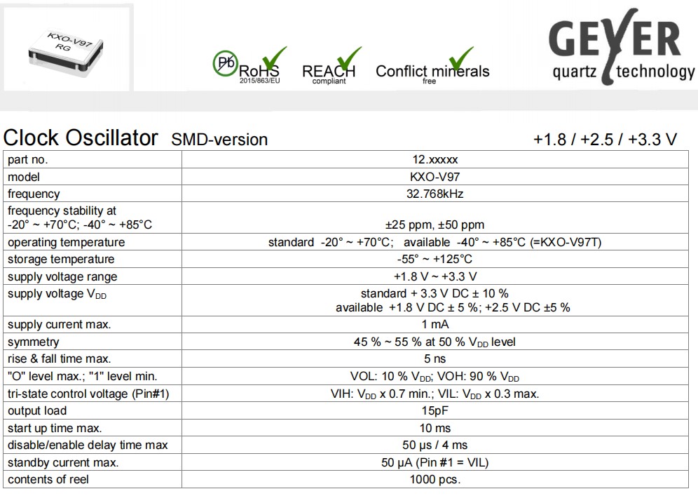 | 12.95104 | Geyer晶振 | XTAL OSC XO 32.7680KHZ SMD | KXO-V96-18 | 32.768 kHz |