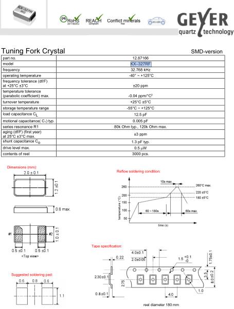 Geyer晶振,KX-327VT晶振,32.768KHZ晶振,32.768K時鐘晶體具有小型,薄型,輕型的貼片晶振表面音叉型晶體振蕩器,產品具有優良的耐熱性,耐環境特性,可發揮晶振優良的電氣特性,符合RoHS規定,滿足無鉛焊接的高溫回流溫度曲線要求,金屬外殼的封裝使得產品在封裝時能發揮比陶瓷振蕩器外殼更好的耐沖擊性.