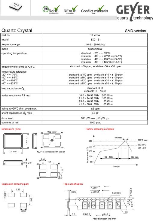 Geyer晶振,KX-5晶振,高品質晶振,貼片晶振本身體積小,超薄型石英晶體振蕩器,特別適用于有目前高速發(fā)展的高端電子數碼產品,因為晶振本身小型化需求的市場領域,小型,薄型是對應陶瓷振蕩器(偏差大)和普通的石英晶體振蕩器(偏差小)的中間領域的一種性價比較出色的產品.產品廣泛用于筆記本電腦,無線電話,衛(wèi)星導航SSD,USB,Blu-ray等用途,符合無鉛焊接的高溫回流焊曲線特性.