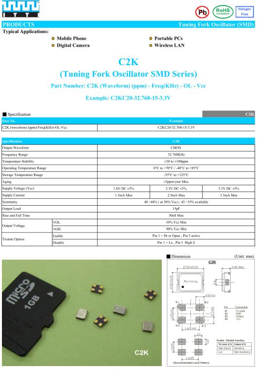 ITTI晶振,C2K晶振,C2KC20-32.768-15-3.3V晶振,32.768K時鐘晶體具有小型,薄型,輕型的貼片晶振表面音叉型晶體振蕩器,產品具有優(yōu)良的耐熱性,耐環(huán)境特性,可發(fā)揮晶振優(yōu)良的電氣特性,符合RoHS規(guī)定,滿足無鉛焊接的高溫回流溫度曲線要求,金屬外殼的封裝使得產品在封裝時能發(fā)揮比陶瓷振蕩器外殼更好的耐沖擊性.