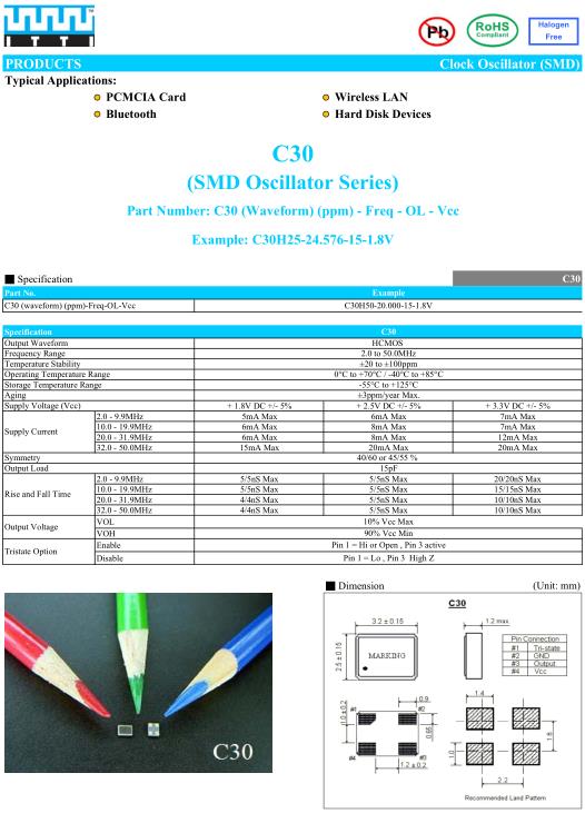 ITTI晶振,C30晶振,C30H25-24.000-15-1.8V晶振,小型SMD有源晶振,從最初超大體積到現(xiàn)在的7050mm,6035mm,5032mm,3225mm,2520mm體積,有著翻天覆地的改變,體積的變小也使產(chǎn)品帶來了更高的穩(wěn)定性能,接縫密封石英晶體振蕩器,精度高,覆蓋頻率范圍寬的特點(diǎn),SMD高速自動安裝和高溫回流焊設(shè)計(jì),Optionable待機(jī)輸出三態(tài)輸出功能,電源電壓范圍:1.8V~5V,高穩(wěn)定性,低抖動,低功耗,主要應(yīng)用領(lǐng)域:無線通訊,高端智能手機(jī),平板筆記本W(wǎng)LAN,藍(lán)牙,數(shù)碼相機(jī),DSL和其他IT產(chǎn)品的晶振應(yīng)用,三態(tài)功能,PC和LCDM等高端數(shù)碼領(lǐng)域,符合RoHS/無鉛.