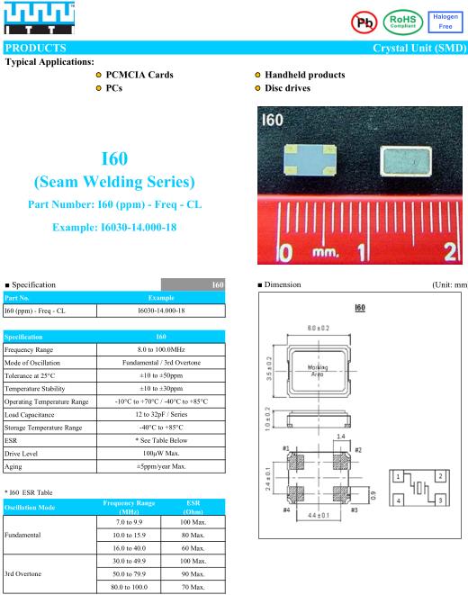 ITTI晶振,I60晶振,I6030-16.000-18晶振,貼片晶振本身體積小,超薄型石英晶體振蕩器,特別適用于有目前高速發展的高端電子數碼產品,因為晶振本身小型化需求的市場領域,小型,薄型是對應陶瓷振蕩器(偏差大)和普通的石英晶體振蕩器(偏差小)的中間領域的一種性價比較出色的產品.產品廣泛用于筆記本電腦,無線電話,衛星導航SSD,USB,Blu-ray等用途,符合無鉛焊接的高溫回流焊曲線特性.