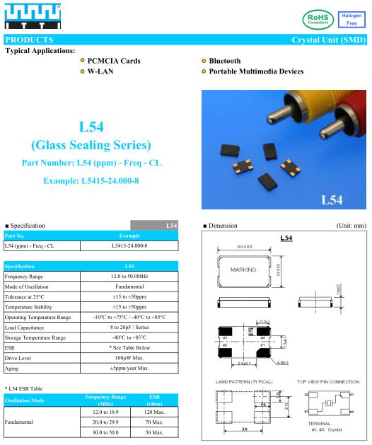 ITTI晶振,L54晶振,L5415-24.000-8晶振,智能手機晶振,產品具有高精度超小型的表面貼片型石英晶體振蕩器,最適用于移動通信終端的基準時鐘等移動通信領域.比如智能手機,無線通信,衛星導航,平臺基站等較高端的數碼產品,晶振本身小型,薄型具備各類移動通信的基準時鐘源用頻率,貼片晶振具有優良的電氣特性,耐環境性能適用于移動通信領域,滿足無鉛焊接的高溫回流溫度曲線要求.
