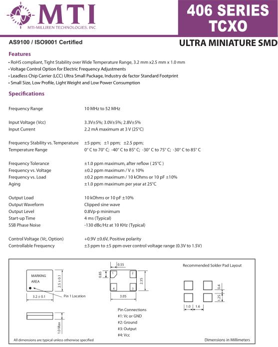 MTI晶振,406晶振,TCXO振蕩器,小型SMD有源晶振,從最初超大體積到現(xiàn)在的7050mm,6035mm,5032mm,3225mm,2520mm體積,有著翻天覆地的改變,體積的變小也使產(chǎn)品帶來(lái)了更高的穩(wěn)定性能,接縫密封石英晶體振蕩器,精度高,覆蓋頻率范圍寬的特點(diǎn),SMD高速自動(dòng)安裝和高溫回流焊設(shè)計(jì),Optionable待機(jī)輸出三態(tài)輸出功能,電源電壓范圍:1.8V~5V,高穩(wěn)定性,低抖動(dòng),低功耗,主要應(yīng)用領(lǐng)域:無(wú)線通訊,高端智能手機(jī),平板筆記本W(wǎng)LAN,藍(lán)牙,數(shù)碼相機(jī),DSL和其他IT產(chǎn)品的晶振應(yīng)用,三態(tài)功能,PC和LCDM等高端數(shù)碼領(lǐng)域,符合RoHS/無(wú)鉛.
