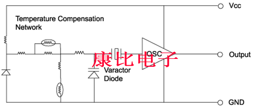 使用標準補償技術,可以在-40℃至+85℃的溫度范圍內實現約±1ppm的分數穩定性.在較窄的溫度范圍內可以實現更好的穩定性.除了最簡單的TCXO晶振之外,所有技術都采用的實際技術是基于與晶振串聯使用的變容二極管,如下所示: 電壓的變化引起變容二極管的電容變化,導致振蕩頻率的變化.熱敏電阻網絡適用于晶體,使電壓隨溫度變化,從而補償晶體的頻率與溫度特性.由于每個TCXO要求其補償網絡與其單個晶體匹配,因此TCXO的成本與頻率與溫度規格的難度密切相關.