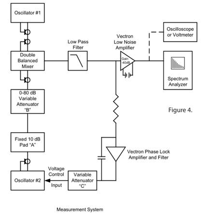 通過(guò)將振蕩器機(jī)械地調(diào)節(jié)到相同的頻率,振蕩器被鎖相到正交.當(dāng)混頻器輸出為0Vdc時(shí),指示兩個(gè)石英水晶振動(dòng)子之間所需的90度相位差.臨時(shí)連接到頻譜分析儀的示波器或零中心電壓表是監(jiān)測(cè)正交進(jìn)度的便捷方式.PLL的工作帶寬必須遠(yuǎn)低于感興趣的最低偏移頻率,因?yàn)镻LL部分地抑制了其帶寬中的相位噪聲.廣泛使用的建立適當(dāng)環(huán)路帶寬的經(jīng)驗(yàn)方法是通過(guò)衰減器"C"逐步衰減電壓控制反饋.通過(guò)在推進(jìn)衰減器"C"的同時(shí)比較感興趣的最低偏移頻率處的連續(xù)噪聲測(cè)量,可以找到操作點(diǎn),其中測(cè)量的相位噪聲不受衰減器設(shè)置的變化的影響.此時(shí),環(huán)路帶寬不是測(cè)量的相位噪聲的因子.