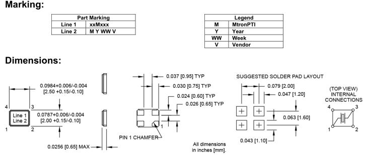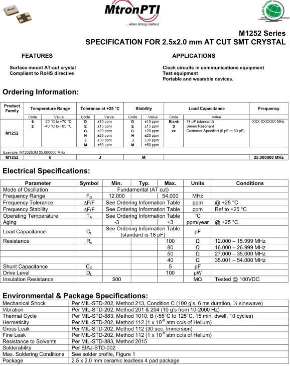 MtronPTI晶振,M1252晶振,M12526JM24.000000MHz晶振,小型貼片石英晶振,外觀尺寸具有薄型表面貼片型石英晶體振蕩器,特別適用于有小型化要求的市場(chǎng)領(lǐng)域,比如智能手機(jī),無(wú)線藍(lán)牙,平板電腦等電子數(shù)碼產(chǎn)品.晶振本身超小型,薄型,重量輕,晶體具有優(yōu)良的耐環(huán)境特性,如耐熱性,耐沖擊性,在辦公自動(dòng)化,家電相關(guān)電器領(lǐng)域及Bluetooth,WirelessLAN等短距離無(wú)線通信領(lǐng)域可發(fā)揮優(yōu)良的電氣特性,滿(mǎn)足無(wú)鉛焊接的回流溫度曲線要求.