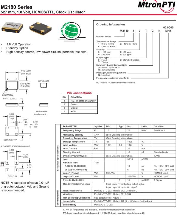 麥特倫皮晶振,M2180晶振,M218013TCN26.0000MHz晶振,小型SMD有源晶振,從最初超大體積到現在的7050mm,6035mm,5032mm,3225mm,2520mm體積,有著翻天覆地的改變,體積的變小也使產品帶來了更高的穩定性能,接縫密封石英晶體振蕩器,精度高,覆蓋頻率范圍寬的特點,SMD高速自動安裝和高溫回流焊設計,Optionable待機輸出三態輸出功能,電源電壓范圍:1.8V~5V,高穩定性,低抖動,低功耗,主要應用領域:無線通訊,高端智能手機,平板筆記本WLAN,藍牙,數碼相機,DSL和其他IT產品的晶振應用,三態功能,PC和LCDM等高端數碼領域,符合RoHS/無鉛.