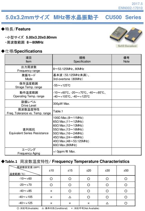 NAKA晶振,CU500晶振,日本納卡株式會社,小型表面貼片晶振型,是標準的石英晶體振蕩器,適用于寬溫范圍的電子數(shù)碼產(chǎn)品,家電電器及MP3,MP4,播放器,單片機等領(lǐng)域.可對應(yīng)8.000MHz以上的頻率,在電子數(shù)碼產(chǎn)品,以及家電相關(guān)電器領(lǐng)域里面發(fā)揮優(yōu)良的電氣特性,滿足無鉛焊接的回流溫度曲線要求.