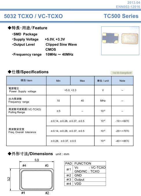 NAKA晶振,TC500晶振,TCXO振蕩器,5032mm體積的石英晶體振蕩器,有源晶振,該產(chǎn)品可驅(qū)動2.5V的溫補(bǔ)晶振,VCXO壓控晶振,VC-TCXO晶體振蕩器產(chǎn)品,電源電壓的低電耗型,編帶包裝方式,可對應(yīng)自動高速貼片機(jī)自動焊接,及IR回流焊接(無鉛對應(yīng)),為無鉛產(chǎn)品,超小型,質(zhì)地輕.產(chǎn)品被廣泛應(yīng)用到集成電路,程控交換系統(tǒng),無線發(fā)射基站.
