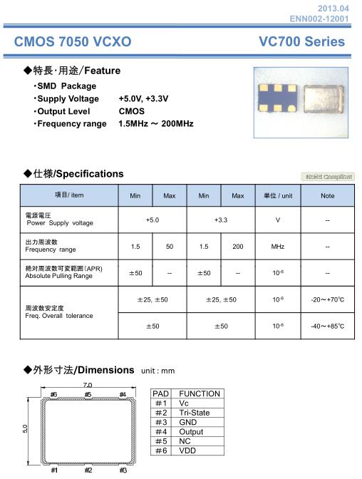 NAKA晶振,VC700晶振,VCXO晶振,小型SMD有源晶振,從最初超大體積到現(xiàn)在的7050mm,6035mm,5032mm,3225mm,2520mm體積,有著翻天覆地的改變,體積的變小也使產(chǎn)品帶來了更高的穩(wěn)定性能,接縫密封石英晶體振蕩器,精度高,覆蓋頻率范圍寬的特點,SMD高速自動安裝和高溫回流焊設(shè)計,Optionable待機輸出三態(tài)輸出功能,電源電壓范圍:1.8V~5V,高穩(wěn)定性,低抖動,低功耗,主要應(yīng)用領(lǐng)域:無線通訊,高端智能手機,平板筆記本W(wǎng)LAN,藍牙,數(shù)碼相機,DSL和其他IT產(chǎn)品的晶振應(yīng)用,三態(tài)功能,PC和LCDM等高端數(shù)碼領(lǐng)域,符合RoHS/無鉛.