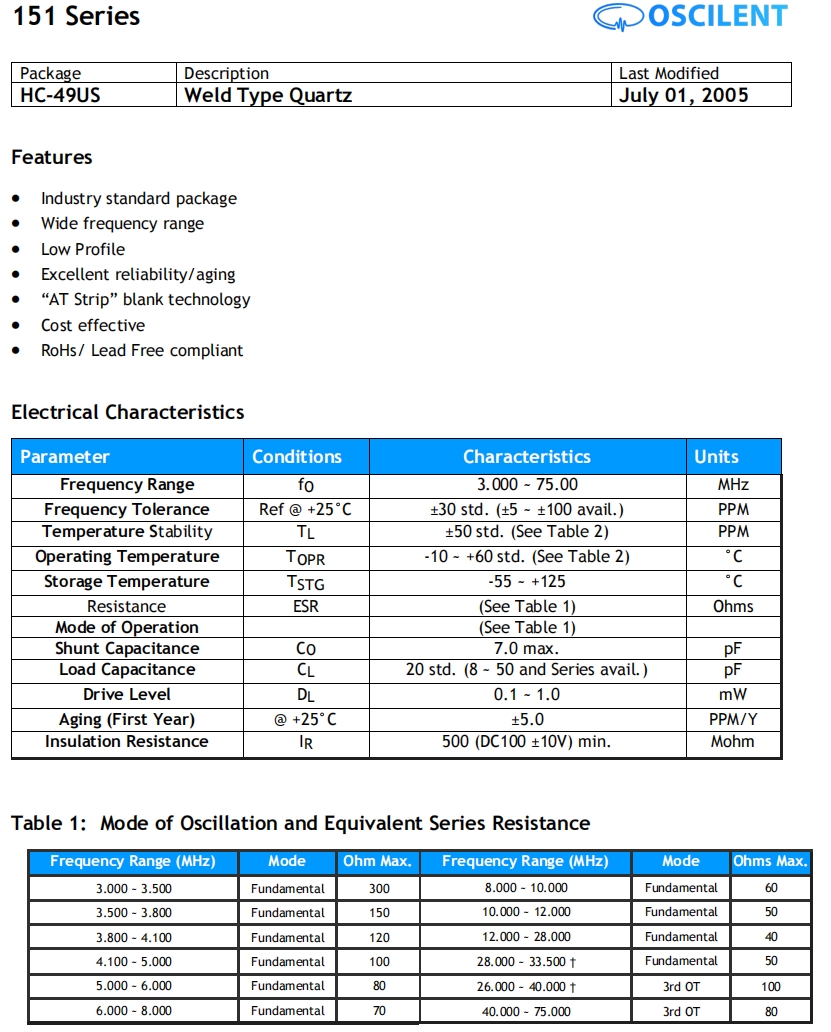 奧斯康利石英晶體,151-12.000M-SR-05-HP-VS,6G通信晶振 參數表