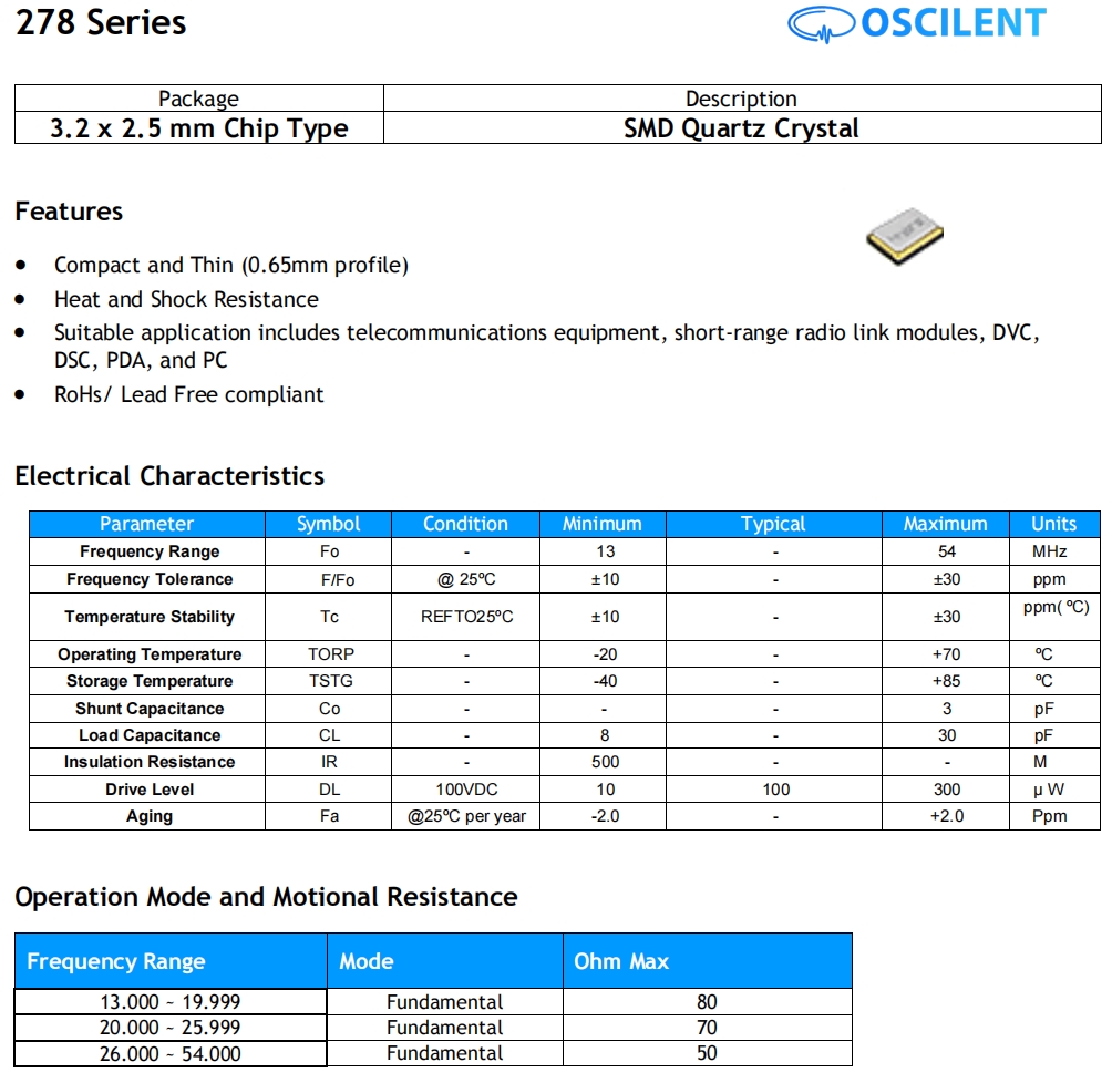27825.0M0910KSTR,6G電信設備晶振,奧斯康利3225mm晶振 參數表