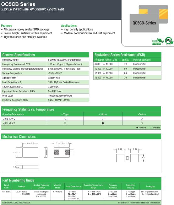 康泰克晶振,QC5CB晶振,QC5CB12.0000F12B33R晶振,小型表面貼片晶振型,是標準的石英晶體振蕩器,適用于寬溫范圍的電子數碼產品,家電電器及MP3,MP4,播放器,單片機等領域.可對應8.000MHz以上的頻率,在電子數碼產品,以及家電相關電器領域里面發揮優良的電氣特性,滿足無鉛焊接的回流溫度曲線要求.