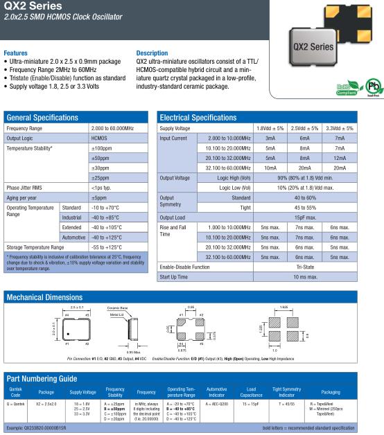 康泰克晶振,QX2晶振,QX233B20.00000B15R晶振,有源晶振,是指晶體本身起振需要外部電壓供應,起振后可直接驅動CMOS集成電路,產品本身已實現與薄型IC(TSSOP封裝,TVSOP封裝)同樣的1mm厚度,斷開時的消費電流是15µA以下,編帶包裝方式可對應自動搭載及IR回流焊接(無鉛對應)產品有幾種電壓供選1.8V,2.5V,3V3.3V,5V,以應對不同IC產品需要.