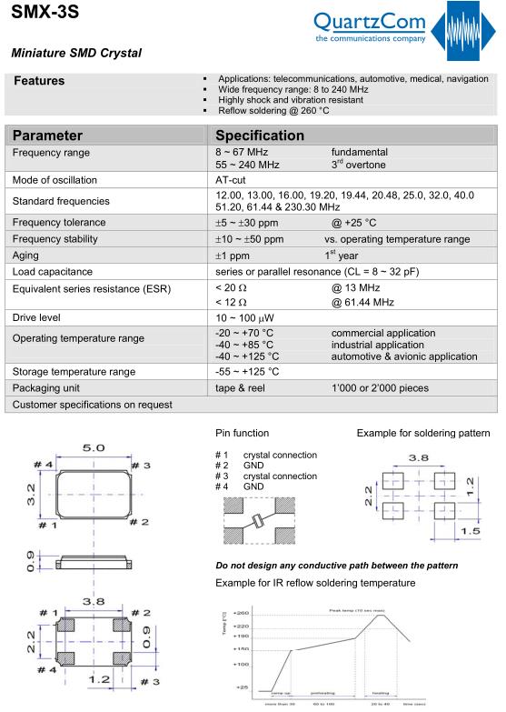 QuartzCom晶振,SMX-3S晶振,無源四腳晶振,小型表面貼片晶振型,是標準的石英晶體振蕩器,適用于寬溫范圍的電子數碼產品,家電電器及MP3,MP4,播放器,單片機等領域.可對應8.000MHz以上的頻率,在電子數碼產品,以及家電相關電器領域里面發揮優良的電氣特性,滿足無鉛焊接的回流溫度曲線要求.