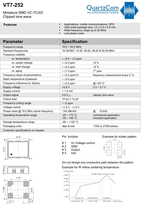 QuartzCom晶振,VT7-252晶振,GPS定位系統晶振,有源晶振,是指晶體本身起振需要外部電壓供應,起振后可直接驅動CMOS集成電路,產品本身已實現與薄型IC(TSSOP封裝,TVSOP封裝)同樣的1mm厚度,斷開時的消費電流是15µA以下,編帶包裝方式可對應自動搭載及IR回流焊接(無鉛對應)產品有幾種電壓供選1.8V,2.5V,3V3.3V,5V,以應對不同IC產品需要.