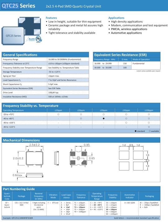夸克晶振,QTC25晶振,QTC2512.0000FBT3I30R晶振,小型貼片石英晶振,外觀尺寸具有薄型表面貼片型石英晶體振蕩器,特別適用于有小型化要求的市場領域,比如智能手機,無線藍牙,平板電腦等電子數碼產品.晶振本身超小型,薄型,重量輕,晶體具有優良的耐環境特性,如耐熱性,耐沖擊性,在辦公自動化,家電相關電器領域及Bluetooth,WirelessLAN等短距離無線通信領域可發揮優良的電氣特性,滿足無鉛焊接的回流溫度曲線要求.