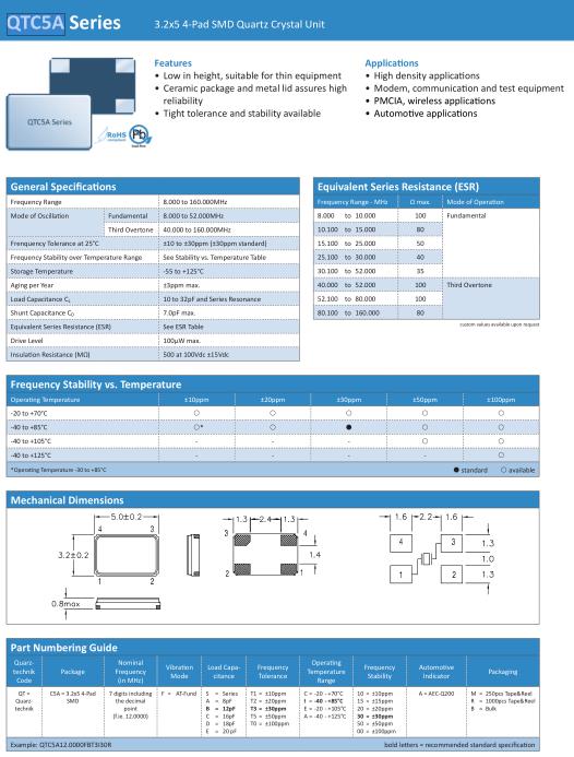 Quarztechnik晶振,QTC5A晶振,QTC5A12.0000FBT3I30R晶振,智能手機晶振,產品具有高精度超小型的表面貼片型石英晶體振蕩器,最適用于移動通信終端的基準時鐘等移動通信領域.比如智能手機,無線通信,衛星導航,平臺基站等較高端的數碼產品,晶振本身小型,薄型具備各類移動通信的基準時鐘源用頻率,貼片晶振具有優良的電氣特性,耐環境性能適用于移動通信領域,滿足無鉛焊接的高溫回流溫度曲線要求.