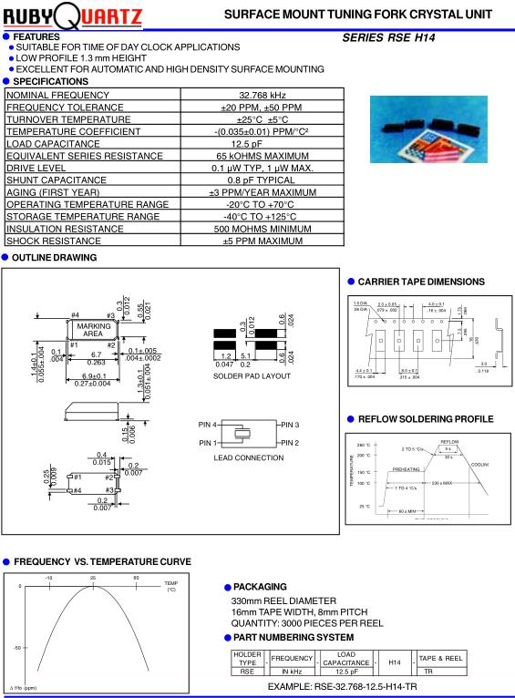 Rubyquartz晶振,H14晶振,RSE-32.768-12.5-H14-TR晶振,32.768K時鐘晶體具有小型,薄型,輕型的貼片晶振表面音叉型晶體振蕩器,產品具有優良的耐熱性,耐環境特性,可發揮晶振優良的電氣特性,符合RoHS規定,滿足無鉛焊接的高溫回流溫度曲線要求,金屬外殼的封裝使得產品在封裝時能發揮比陶瓷振蕩器外殼更好的耐沖擊性.