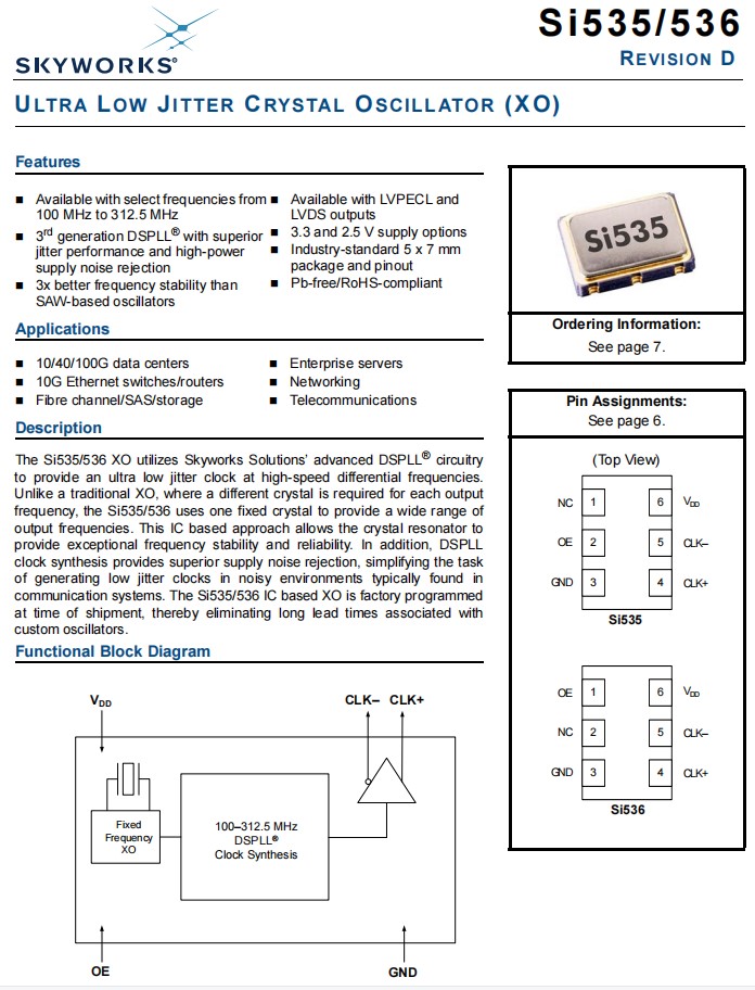 | 535AB000305DG | Skyworks晶振 | Si535 | 156.2578 MHz | LVPECL | 3.3V |