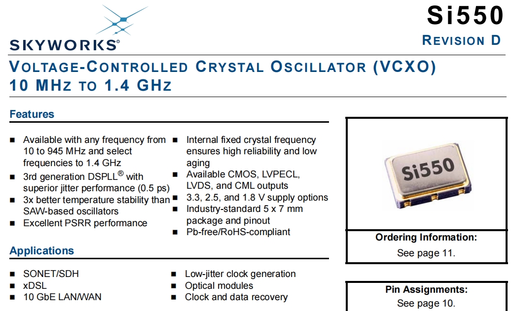 | 550BA125M000DGR | Skyworks有源晶振 | XTAL OSC VCXO 125.0000MHZ LVDS | Si550 | 125 MHz | LVDS |