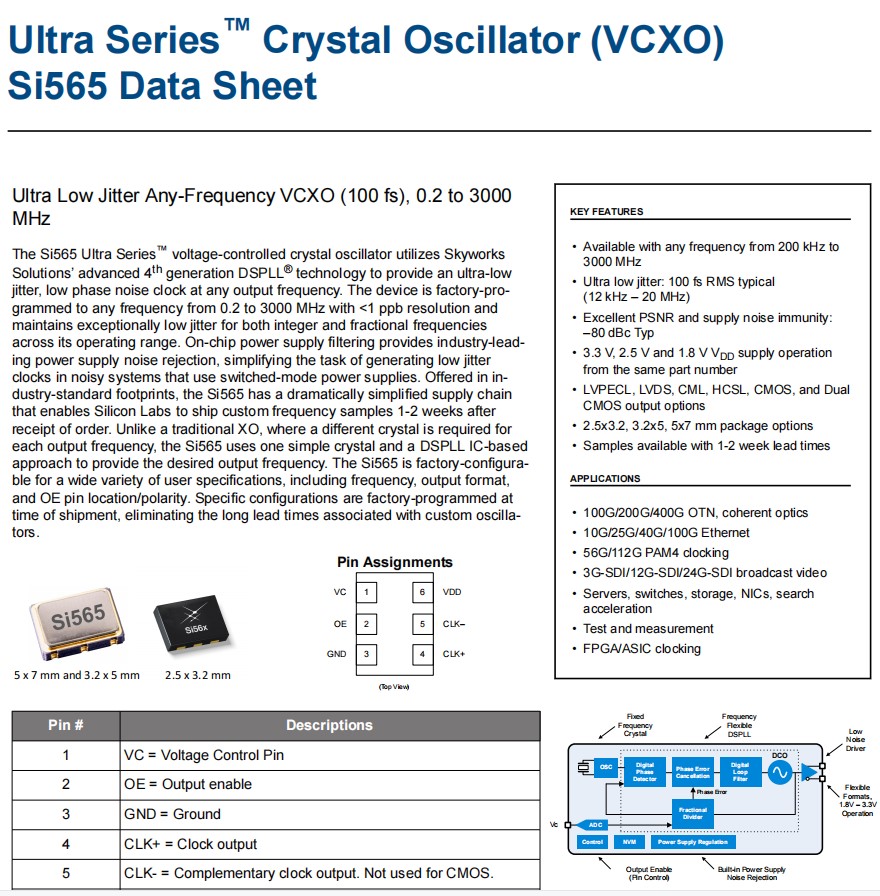 | 565BAA100M000CCG | Skyworks晶振 | Si565 | 100 MHz | LVDS |