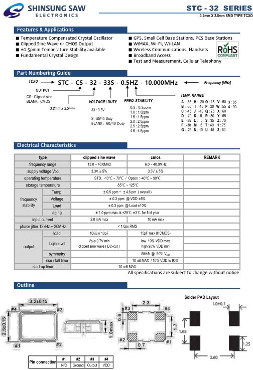 Shinsung晶振,STC-32晶振,STC-CS-32-33S-0.5HZ-20.000MHz晶振,小型SMD有源晶振,從最初超大體積到現(xiàn)在的7050mm,6035mm,5032mm,3225mm,2520mm體積,有著翻天覆地的改變,體積的變小也使產(chǎn)品帶來(lái)了更高的穩(wěn)定性能,接縫密封石英晶體振蕩器,精度高,覆蓋頻率范圍寬的特點(diǎn),SMD高速自動(dòng)安裝和高溫回流焊設(shè)計(jì),Optionable待機(jī)輸出三態(tài)輸出功能,電源電壓范圍:1.8V~5V,高穩(wěn)定性,低抖動(dòng),低功耗,主要應(yīng)用領(lǐng)域:無(wú)線通訊,高端智能手機(jī),平板筆記本W(wǎng)LAN,藍(lán)牙,數(shù)碼相機(jī),DSL和其他IT產(chǎn)品的晶振應(yīng)用,三態(tài)功能,PC和LCDM等高端數(shù)碼領(lǐng)域,符合RoHS/無(wú)鉛.