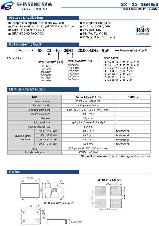 Shinsung晶振,SX-22晶振,SX-22-10-20HZ-20.000MHz-9pF晶振,小型貼片石英晶振,外觀尺寸具有薄型表面貼片型石英晶體振蕩器,特別適用于有小型化要求的市場(chǎng)領(lǐng)域,比如智能手機(jī),無線藍(lán)牙,平板電腦等電子數(shù)碼產(chǎn)品.晶振本身超小型,薄型,重量輕,晶體具有優(yōu)良的耐環(huán)境特性,如耐熱性,耐沖擊性,在辦公自動(dòng)化,家電相關(guān)電器領(lǐng)域及Bluetooth,WirelessLAN等短距離無線通信領(lǐng)域可發(fā)揮優(yōu)良的電氣特性,滿足無鉛焊接的回流溫度曲線要求.