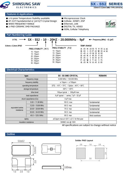 Shinsung晶振,SX-SS2晶振,SX-SS2-10-20HZ-20.000MHz-8pF晶振,智能手機晶振,產(chǎn)品具有高精度超小型的表面貼片型石英晶體振蕩器,最適用于移動通信終端的基準時鐘等移動通信領(lǐng)域.比如智能手機,無線通信,衛(wèi)星導(dǎo)航,平臺基站等較高端的數(shù)碼產(chǎn)品,晶振本身小型,薄型具備各類移動通信的基準時鐘源用頻率,貼片晶振具有優(yōu)良的電氣特性,耐環(huán)境性能適用于移動通信領(lǐng)域,滿足無鉛焊接的高溫回流溫度曲線要求.