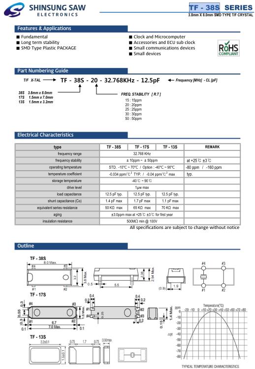 Shinsung晶振,TF-38S晶振,TF-38S-20-32.768KHz-12.5pF晶振,32.768K時(shí)鐘晶體具有小型,薄型,輕型的貼片晶振表面音叉型晶體振蕩器,產(chǎn)品具有優(yōu)良的耐熱性,耐環(huán)境特性,可發(fā)揮晶振優(yōu)良的電氣特性,符合RoHS規(guī)定,滿(mǎn)足無(wú)鉛焊接的高溫回流溫度曲線(xiàn)要求,金屬外殼的封裝使得產(chǎn)品在封裝時(shí)能發(fā)揮比陶瓷振蕩器外殼更好的耐沖擊性.
