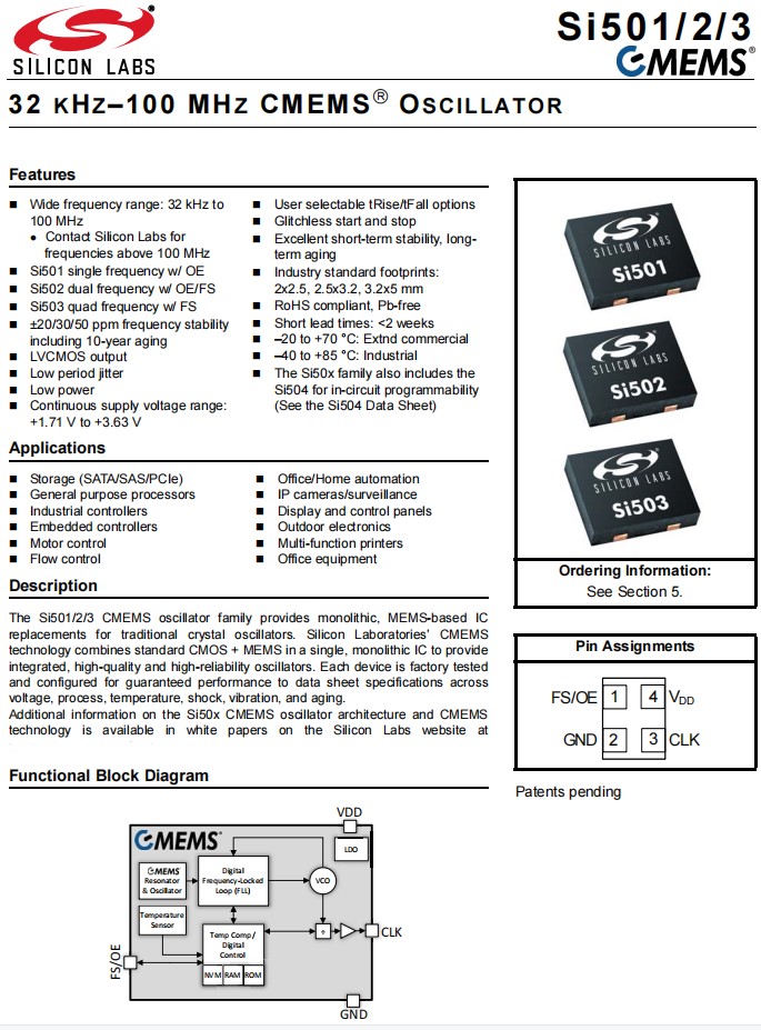 501BCA16M0000CAG,16MHz,3225mm,Silicon有源晶振,Si501,辦公設備應用晶振,參數表
