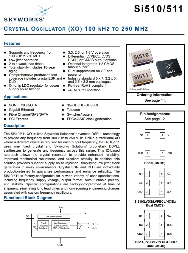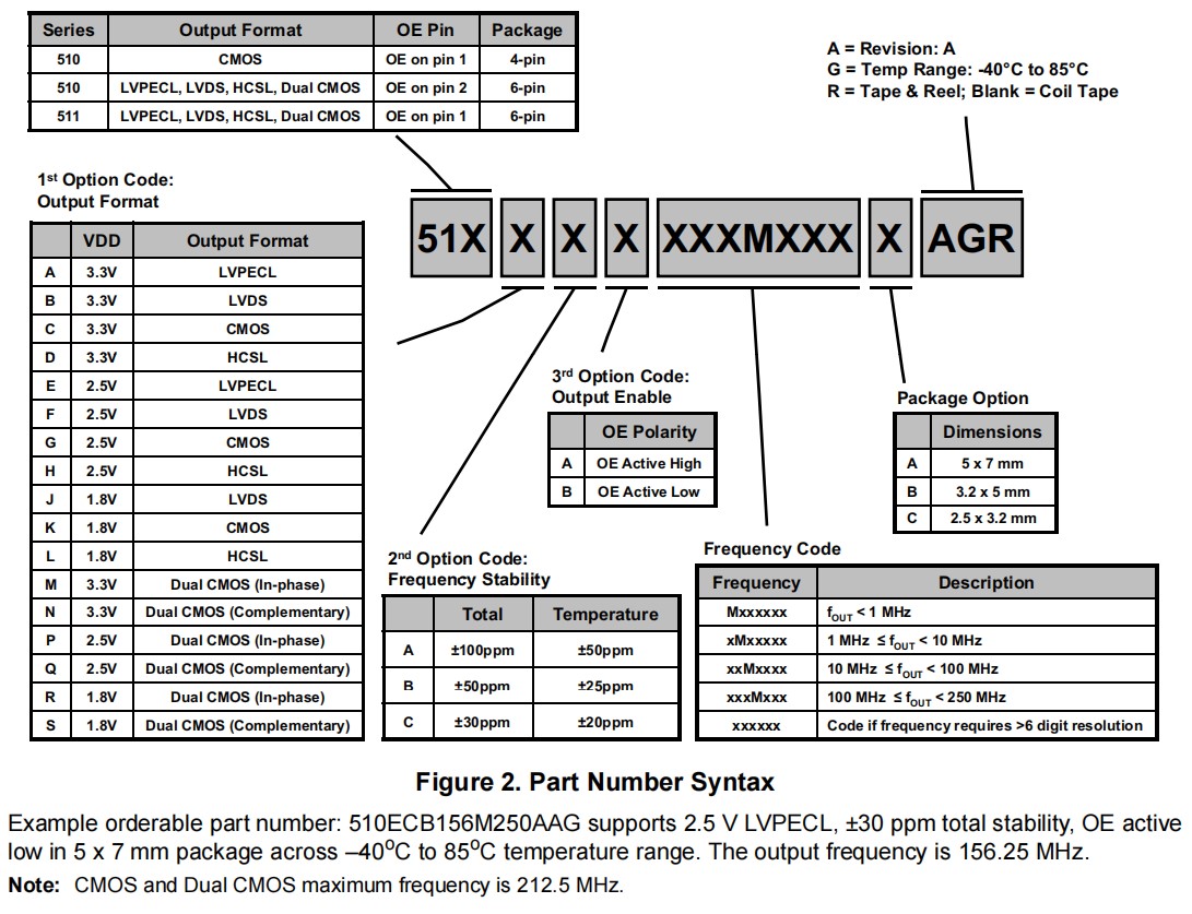 Si510支持多種選項,包括頻率、穩定性、輸出格式和VDD。特定的設備配置在裝運時被編程到Si510中。可以使用下面的零件號配置圖進行配置。Skyworks解決方案提供了一個基于web瀏覽器的部件號配置實用程序,以簡化這個過程。