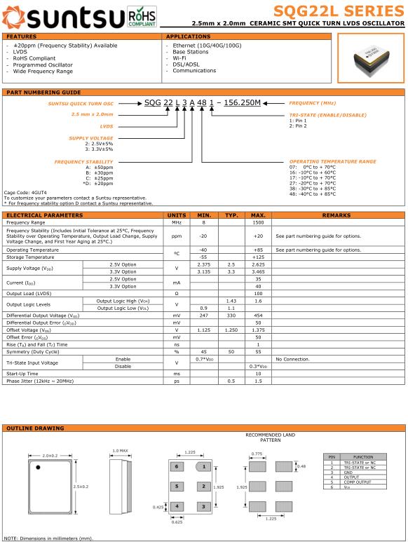 Suntsu晶振,SQG22L晶振,SQG22L3A481-8.000M晶振,有源晶振,是指晶體本身起振需要外部電壓供應,起振后可直接驅動CMOS集成電路,產品本身已實現與薄型IC(TSSOP封裝,TVSOP封裝)同樣的1mm厚度,斷開時的消費電流是15µA以下,編帶包裝方式可對應自動搭載及IR回流焊接(無鉛對應)產品有幾種電壓供選1.8V,2.5V,3V3.3V,5V,以應對不同IC產品需要.