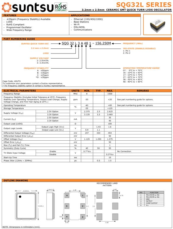 Suntsu晶振,SQG32L晶振,SQG32L3A481-12.000M晶振,小型SMD有源晶振,從最初超大體積到現(xiàn)在的7050mm,6035mm,5032mm,3225mm,2520mm體積,有著翻天覆地的改變,體積的變小也使產(chǎn)品帶來了更高的穩(wěn)定性能,接縫密封石英晶體振蕩器,精度高,覆蓋頻率范圍寬的特點,SMD高速自動安裝和高溫回流焊設(shè)計,Optionable待機輸出三態(tài)輸出功能,電源電壓范圍:1.8V~5V,高穩(wěn)定性,低抖動,低功耗,主要應用領(lǐng)域:無線通訊,高端智能手機,平板筆記本W(wǎng)LAN,藍牙,數(shù)碼相機,DSL和其他IT產(chǎn)品的晶振應用,三態(tài)功能,PC和LCDM等高端數(shù)碼領(lǐng)域,符合RoHS/無鉛.